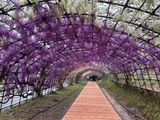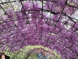 初の藤の花。今年は開花が少し遅れているらしく、7分咲きとの事でした。河内藤は約3,000坪の広大な敷地に、樹齢150年になるいくつもの木がドームや藤棚を作りだして、長さが80m、110mのトンネルは、22種類の藤の花が咲き薄紫や白、ピンクなどカラフルな花で彩られたグラデーションで見る人々を魅了します。園内に漂う香りにも癒やされ、全身で藤を楽しむことができます。