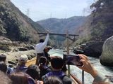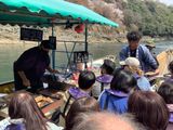 川下りは、亀岡から嵯峨までの16kmを山々の谷間をぬって下って行きます。今回は川の水量が少なかったようでいつもより長く舟旅を楽しむことが出来ました。船頭さんのガイドは、ユーモアたっぷりで笑いが絶えません。途中に団子や甘酒を売る舟があります。