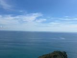 とてもよい天気で青い空、綺麗な海と顔が白いマモルくん、とても良いです。