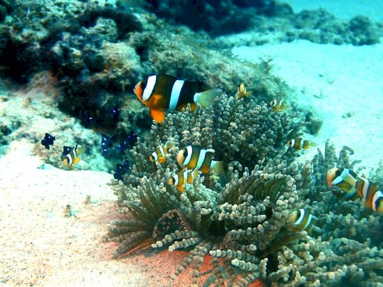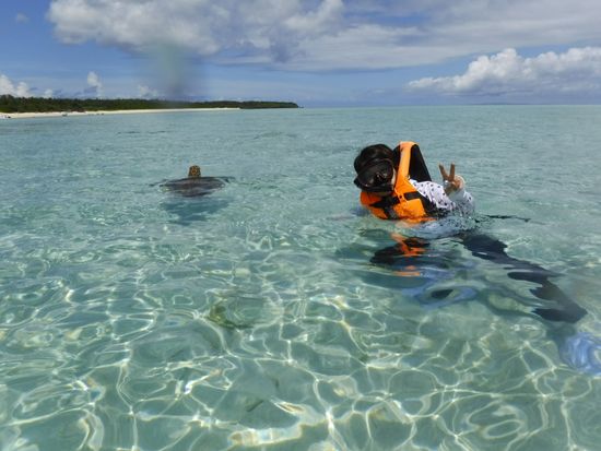 天気はやや曇り気味でベタ凪、時刻は午後12時、絶好の気象条件。大、中、小の亀が目の前で海藻を食べており、近づいても全く逃げません。水深は1m程度で、こんなに浅いところで亀と泳げるのには感激しました。大きい亀は、1m位はありました。 その後のシュノーケリングも魚の種類が多くて大変良かったです。