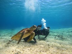 - ウミガメは餌付けなどしていない野生の生き物の為、まれに見れない日もあります。またずっと一緒に泳げる時もあれば、すぐに去ってしまう場合もあります。ご理解のほど、お願いいたします。