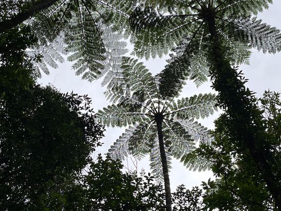 上を見上げると、大きなヒカゲヘコ、そして足元に『となりのトトロ』で傘代わりに使われていた、大きなクワズイモが。さらに進むと、樹齢150年以上を誇る大きなどんぐりの木(オキナワウラジロガシ)も待っています。