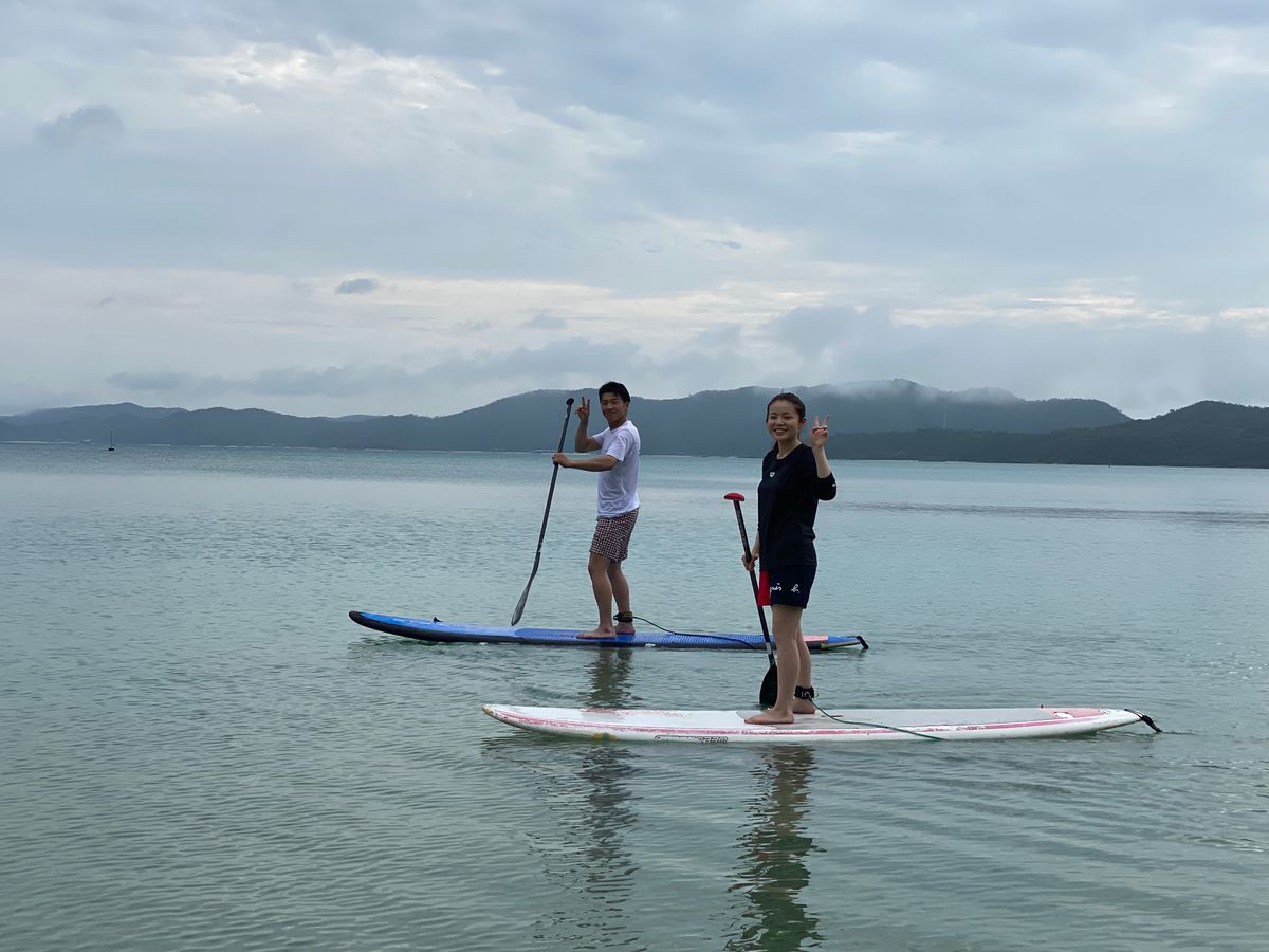 前日は雨でしたがそれでも本州の海より綺麗で、当日は梅雨明けで天気もよく、さらに海が綺麗で感動しました。ウミガメも見られました!SUPは初めてでしたが、丁寧に教えていただき、十分に楽しめました。初心者コースであまり難しいことはしませんでしたが、次回はもっと色々なことに挑戦したいと思えました。注意点としては、日光がとても強くおそらく海からの反射もあるので日焼け止めがあったほうがいいと思います。