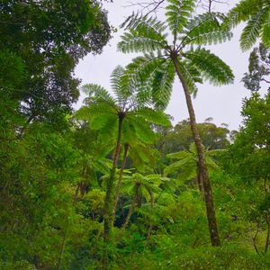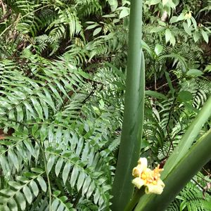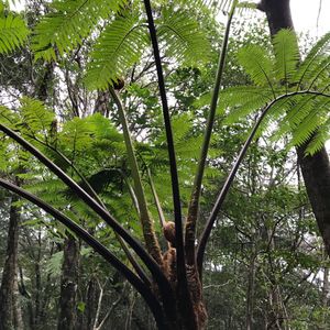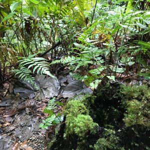 車を降りて植物の説明をしていただきながら進んでいると、早々に雨が。猛烈な雨になりましたが、傘を取りに行っていただき、それほど濡れずに済みました。しばらく進むと、太古の昔にタイムスリップしたようなところへ!