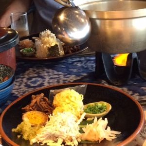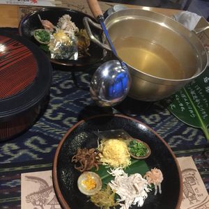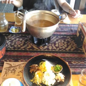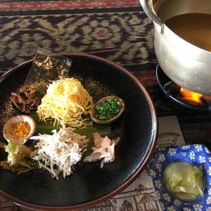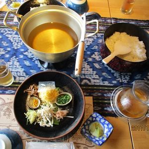 ご飯を自分でよそって、具を並べて、スープを掛けていただきます。