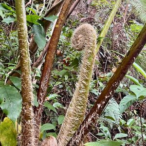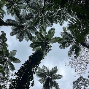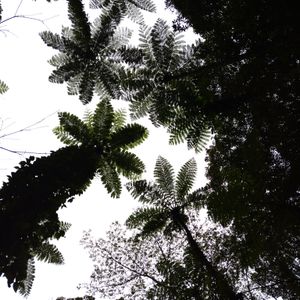 頭上を見上げると、幾何学模様ような葉をした巨大なヒカゲヘゴ