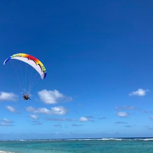 初のパラセーリング。小学生の息子が、やってみたい!の、一声で予約しました。最高の15分、贅沢な15分でした。いつもは、海に潜ってウミガメやサンゴを見ていましたが、上から見る海もまた最高に綺麗でした。自分のスマホで撮影出来るのも最高です。落下防止のストラップも用意されていました。インストラクターの方も、空を飛びながら色々と説明してくださり、操縦も抜群で安心して楽しめました。もう最高としか言えません。息子達も、最高!楽しかった!と、大満足でした。また必ずリピートします。最高な時間をありがとうございました。