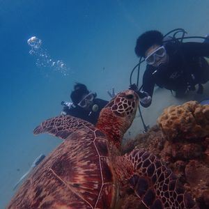 集合時間にショップに行くと、ウエットスーツに着替えて丁寧に説明を受けました。水中メガネも度付きが借りられるので、コンタクトを外して水中でも気にせず快適に過ごせます。ショップから車で5分程の手広海岸で潜るそうで、ここはウミガメが3匹住み着いているそうで出会えたらラッキー。ビーチから海に入って呼吸の練習から徐々に沈んで行きます。連れはダイビングが始めてだったので少し不安に感じていたみたいですが、ゆっくり教えてもらったので大丈夫でした。沖に向かって泳いでいくと、そこにはウミガメの姿が!ゆっくり近づきすぎないように見てたけど、お食事中だったのでこちらを気にせずむしろ近づいてきました。「こんなにじっくり観察できることは、めったにないよ‼︎」ってガイドさんも言っていました。ほとんどの時間をウミガメと一緒に過ごせて、キレイな海で感動の思い出ができました。陸に上がってからはボンベと重りで重力を感じましたが、全て楽しい思い出です。お世話になりました。ありがとうございます。