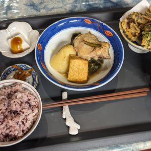 お昼のハナハナ茶屋では、柔らか〜い豚肉や天ぷらなどがとても美味しく、地域に伝わる行事のお話をうかがうこともできました。
