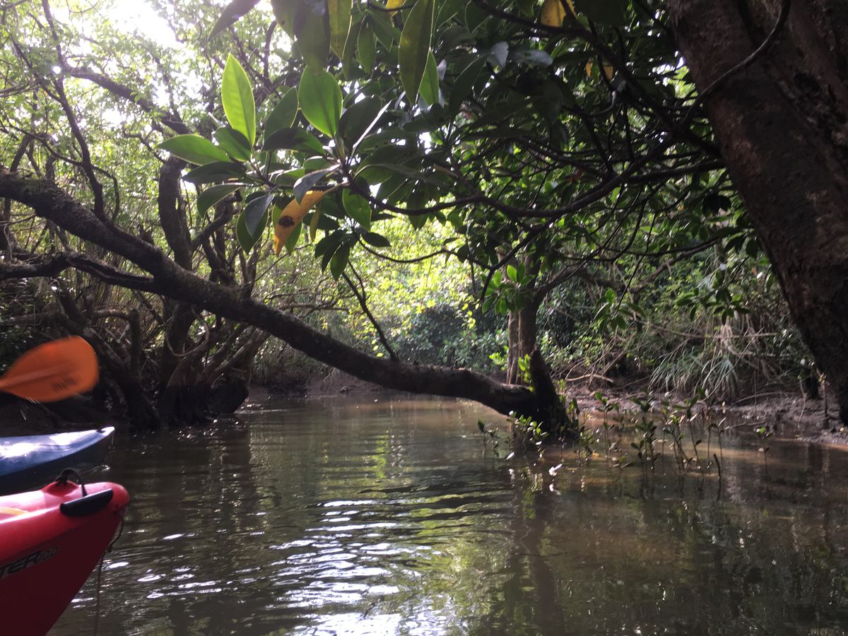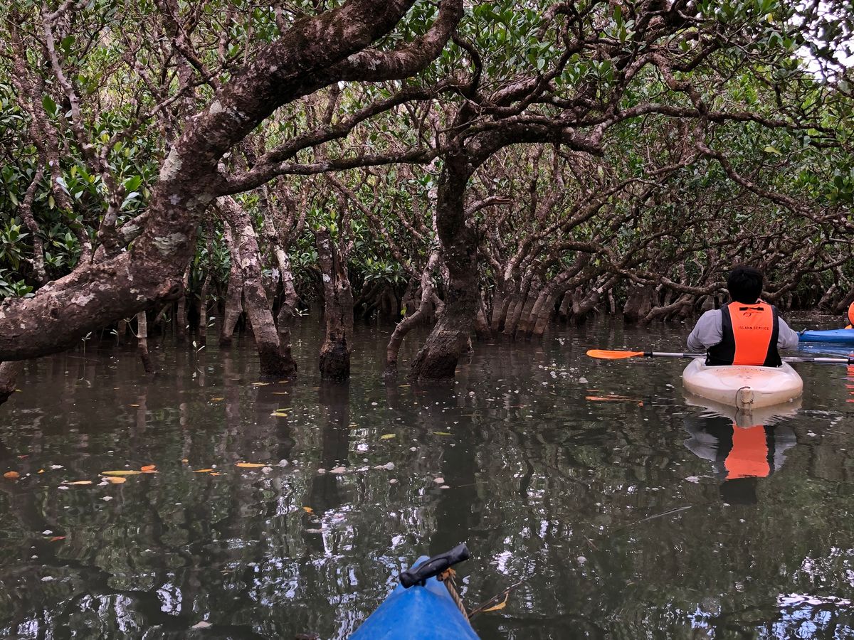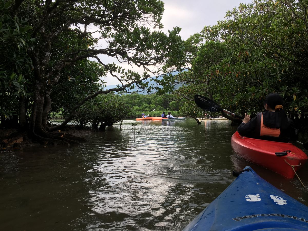 初めてのカヌー体験。どれだけ濡れるのか、どれだけ疲れるのか、次の日は筋肉痛?ひっくり返ったらどうするの?いろいろな不安はありましたが、丁寧に指導してくださりいざスタート。「潮が良いので今日は細い水路に入りましょう」と早速冒険気分。張り出した枝に刺さりそうになりながらマングローブ体験をしてきました。カニとか生物にはあまり遭遇しませんでしたが、水もきれいで、魚が泳いでいるのがよく見えました。ガイドさんがわざわざ水に入って記念撮影してくれたり、サービスも良かったです。あっという間の2時間。もう終わり?みたいな。最後に「風があったらなかなか帰ってこれないんですよ」とコメントいただきガッテンしました。