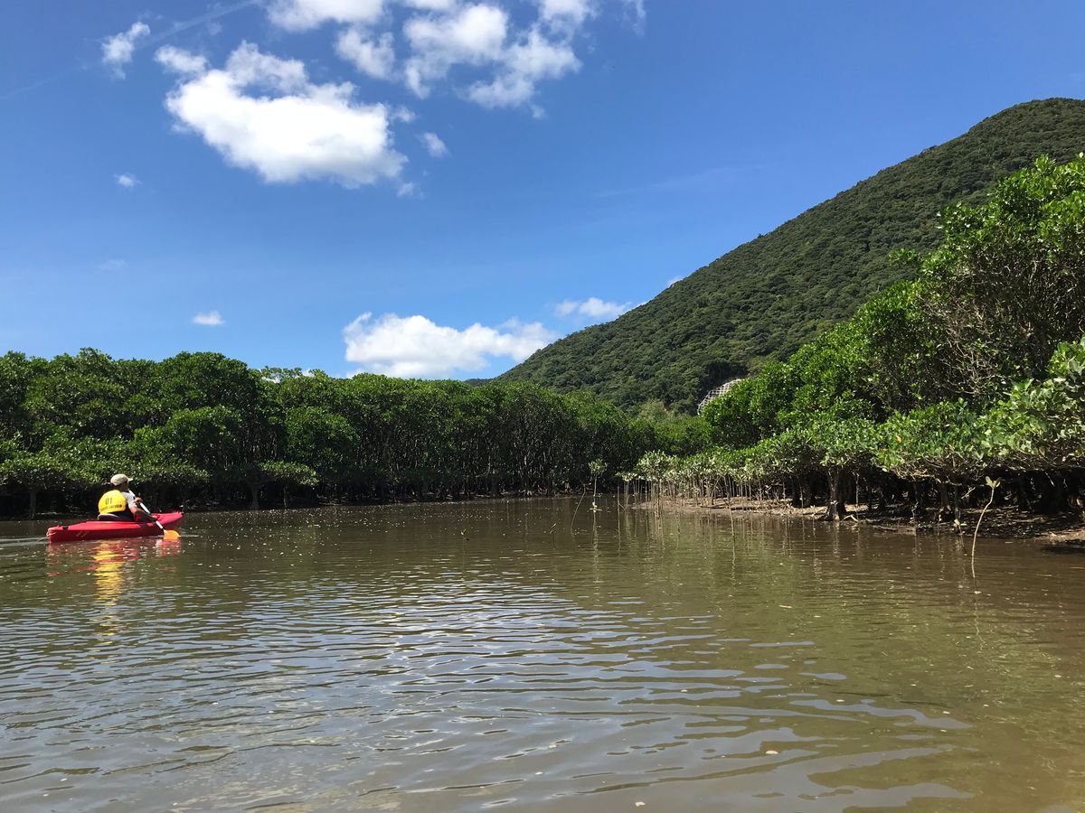 マングローブの森は海外のそれより整然として爽やかな印象でした。風も穏やかで、午後の木漏れ日がキラキラと輝いて見えました。細い水路を抜けたり、広い水面に出たり、いろんな景色を楽しめます。カヌーは初めてでしたが、自分たちのペースでゆったり楽しめました。