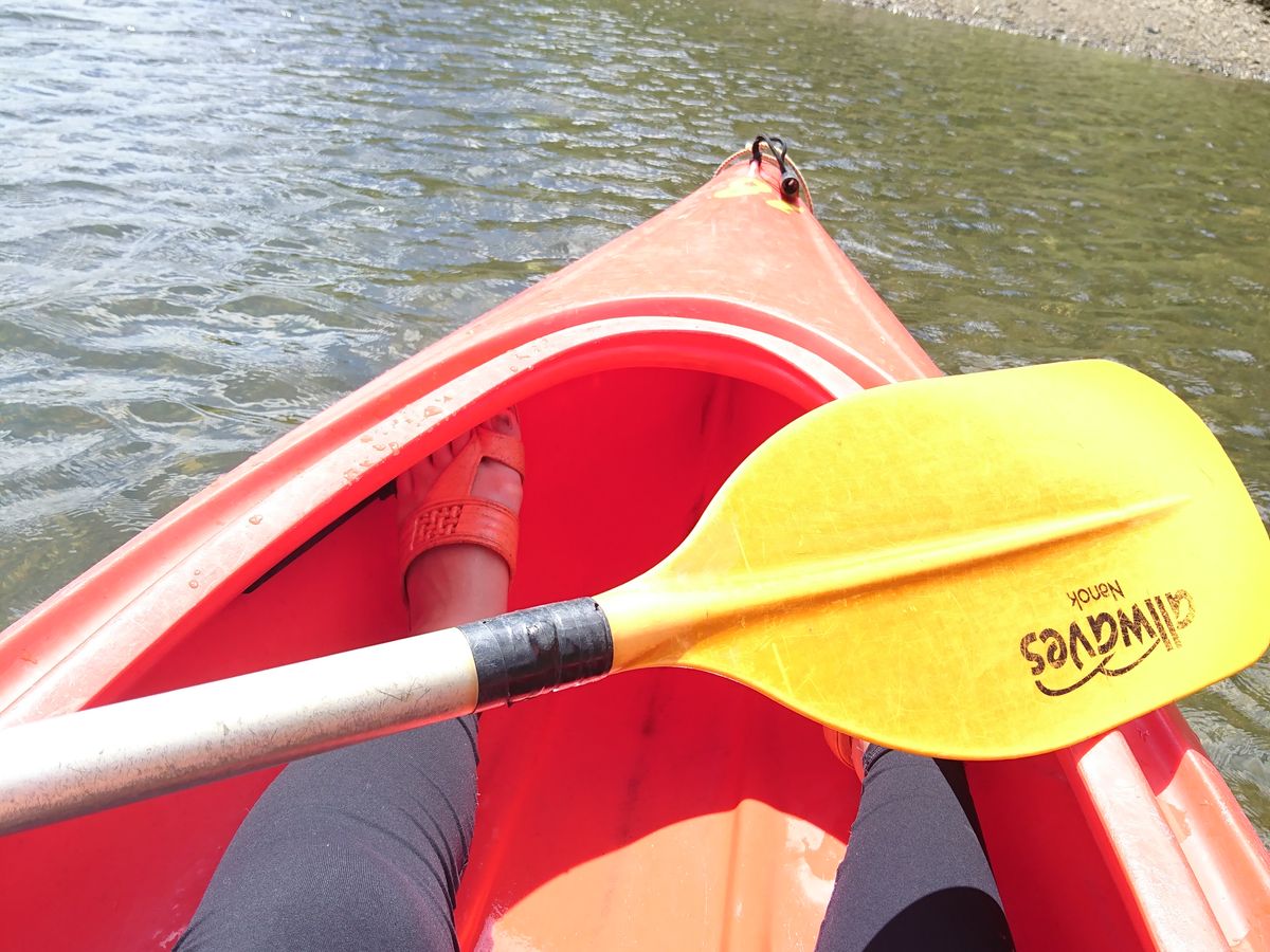 オールから水が垂れてくるので濡れます!日焼け対策しっかりしてください!彼は、カヌーから出ていた膝小僧がかなり日焼けしちゃってました。