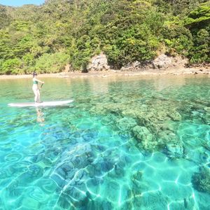 古仁屋港8:10の船に乗り、加計呂麻島上陸。生間港でピックアップしていただき、そのままマリンアクティビティを行う場所へ連れて行ってくださいました。その日の海況に合わせて、この日はスリ浜でSUPとシュノーケリングを体験しました。ガイドの齋藤さんは物腰柔らかで、終始安心して楽しくツアーに参加できました。台風の影響が心配されたものの、コバルトブルーに輝くスリ浜がとっても美しく、SUPボードの上からもしっかり海中のサンゴがきれいに見られました。シュノーケリングでも様々な魚たちを見ることができ、ずっと見ていても飽きない楽しいひとときでした。