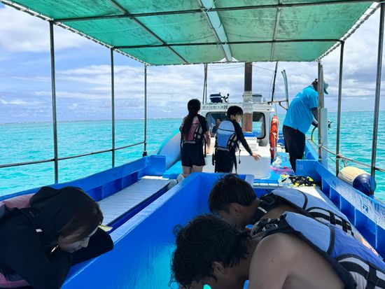 グラスボートに乗船し、いよいよ百合ヶ浜に向けて出発です。心地良い潮風を感じながら、南の海を満喫!