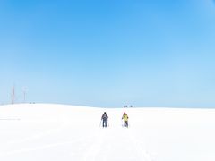 青森市内で体験できる雪原散策ツアー。ツアーで使用する「スノーハイク」とはスキーとスノーシューの良いところだけを合わせて作られたBluemoris社オリジナルの歩くスキーです。ヒールフリーでハードブーツは必要なく、どんなブーツにもフィットします。滑走面の加工で登りはもちろん、下りもスムーズです。ワイドな板は新雪や深雪で威力を発揮します。初めてスノーシューを経験する方にも簡単に楽しめます。