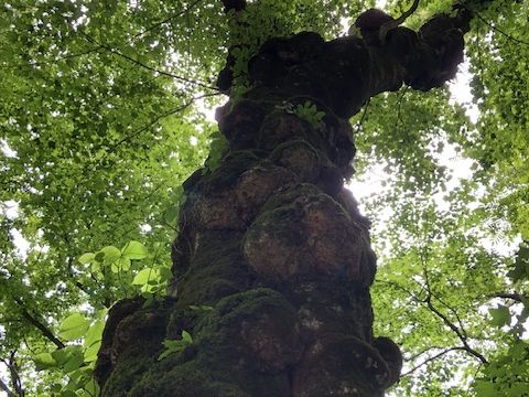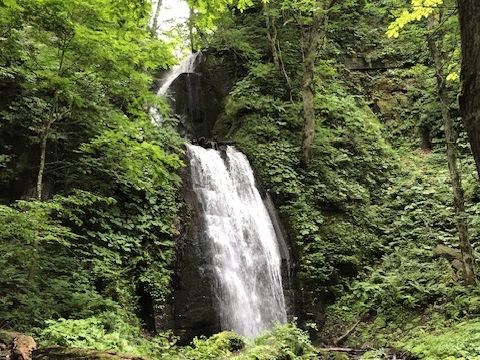 さて当日、2名のガイドさん、私たち二人組ともう1グループの計6名で、石ヶ戸休憩所からパラパラと降る雨の中、雨具の上着と帽子、長靴の足ごしらえで出発。雨を含んだブナの幹の解説から始まった蘊蓄の数々は、小雨の天候ならではのものを含めてウンウンとうならせます。夏なのに23℃程度の気温で雨具を着ていても暑くないギリギリの気候で、途中雨も上がって思ったよりも快適に足が動きます。道中の植物、動物、そして渓谷の歴史の跡など自分たちだけで歩いていたのでは気づかぬことをいっぱい教えていただいて、雲井の滝のゴール。ここで車から降りてきたばかり?のたくさんの観光客と遭遇。2時間のウォーキングですっかり賢くなった私たちはちょっと違うのよ、という感情を押し殺して滝の前で皆さんと同じように写真を撮って、お開きとなりました。