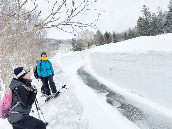 毎年4月1日に開通する八甲田雪の回廊で最大8メートルにもなる雪壁の上をスノーシューで散策!