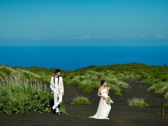ウェディングフォト 日本唯一の黒色の「裏砂漠」で撮影 地上からは撮れない美しい景色を写せるドローン撮影付き<衣装持ち込み/80カット/伊豆大島>