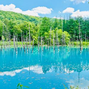 青い池は思っていたより薄い色でしたが、天気が良くとても綺麗でした。