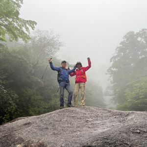 小雨の中、登山経験のない私。途中挫折満々で参加。夫は行く気満々。半分まできて休憩。これで帰ったら夫にずっと言われると迷っていたら、ガイドさんが迷っているなら行きましょうと出発?!で、結果、太鼓岩登頂!途中で帰らなくてよかった〜。目標達成感ありあり!
