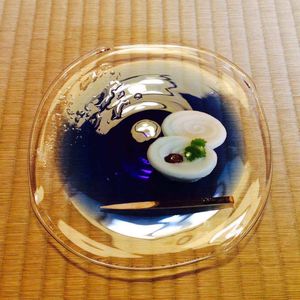 体験談をお寄せいただき、ありがとうございます。日本語と英語の「薄茶のいただきかた」をはじめにお渡ししたのですが、やはりあれこれの説明がうまくできませんでした。特に夏のこの季節、涼しげな席にしたいとあれこれ取り揃えた道具は、はたしてどう感じられたか心もとなく思っております。、床には良寛筆の「水」一字の拓本、花は水辺に咲く白花さくら蓼、蓋置きは井戸の中を覗く唐子の一閑人、風炉先は萩簾に利休草をあしらわせていただきました。お菓子は青の手吹きガラスに、練りきりの「流水」・風林堂本店。水点前で冷たいお茶をさし上げようかとも存じましたが、初めての体験で、簡略化された点前よりも普通の点前をと思い、風炉釜の炭の暑さに耐えていただきました。道具の拝見で、遠州菱の蒔絵の面中次の棗が、小堀遠州の紋であることなど説明を試みたのですが、そういった細かい説明になると、どうしても言葉の壁の高さにもどかしさを覚えました。少し英会話を学ばなければと痛感いたしました。またお見えのときには、もうすこしうまく説明できるようがんばります。ぜひまたお越しくださるよう、お待ち申しております。
