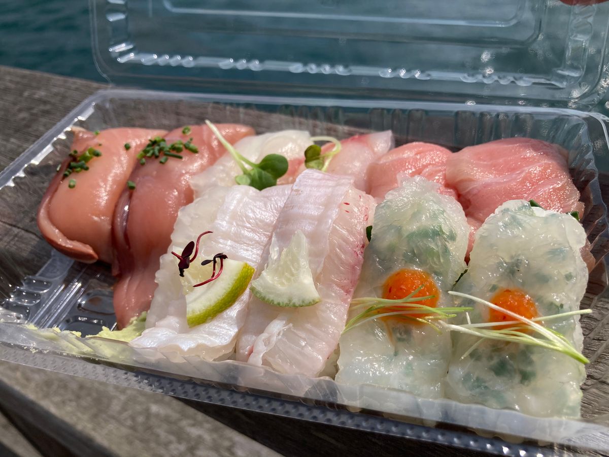 関門大橋を眺めながら外で食べるお寿司は最高でした。