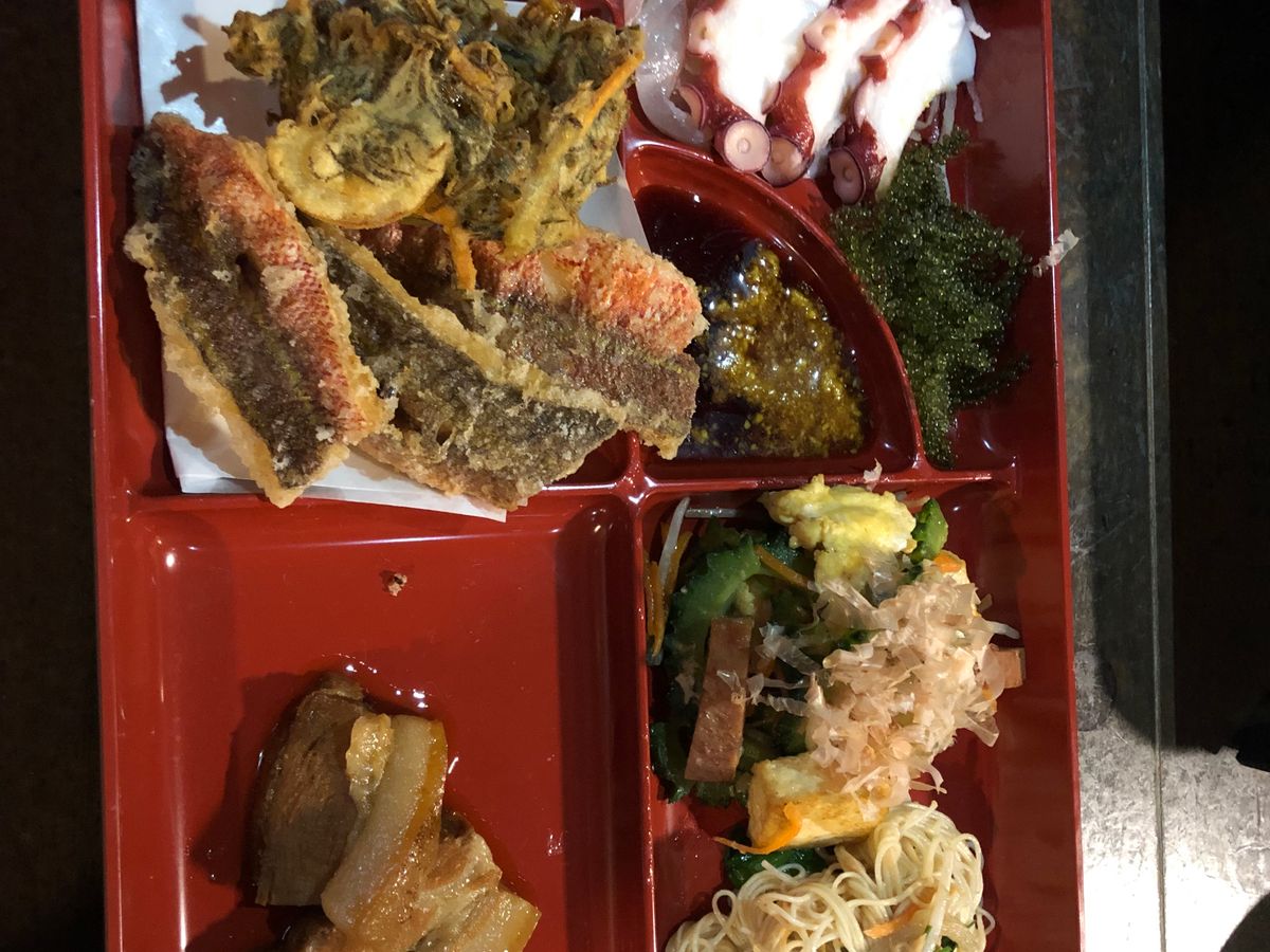結果から言うと予約して正解でした。当日は予約だけで満席で、飛び込みでは入れず、しかもワンプレートの夕食は、写真のように様々な沖縄料理が少しずつ食べられますので満足感も大きいです。ワンドリンクは、泡盛の水割りにしましたが、おつまみとしても相性が良かったです。