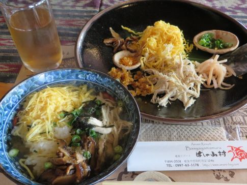 どんなものかドキドキでしたが、ばしゃ山村さんはすぐに場所もわかりました。お料理はご飯に卵焼き鶏肉、しいたけ、ネギなどをトッピングし鶏ガラ出汁のスープをかけていただく、優しい味でした。ご飯やスープはおかわり自由でした。あっさりしておりとっても美味しかったです。また、ドリンクもマンゴーやパッションフルーツなど南国らしいフルーツのドリンクもあり満足でした。海の見えるステキなレストランでゆっくりと食事ができました。