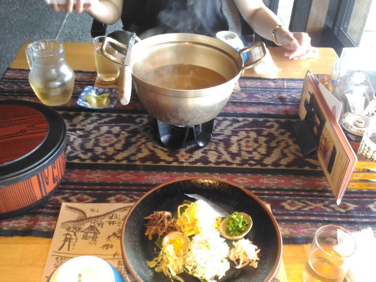 ご飯を自分でよそって、具を並べて、スープを掛けていただきます。