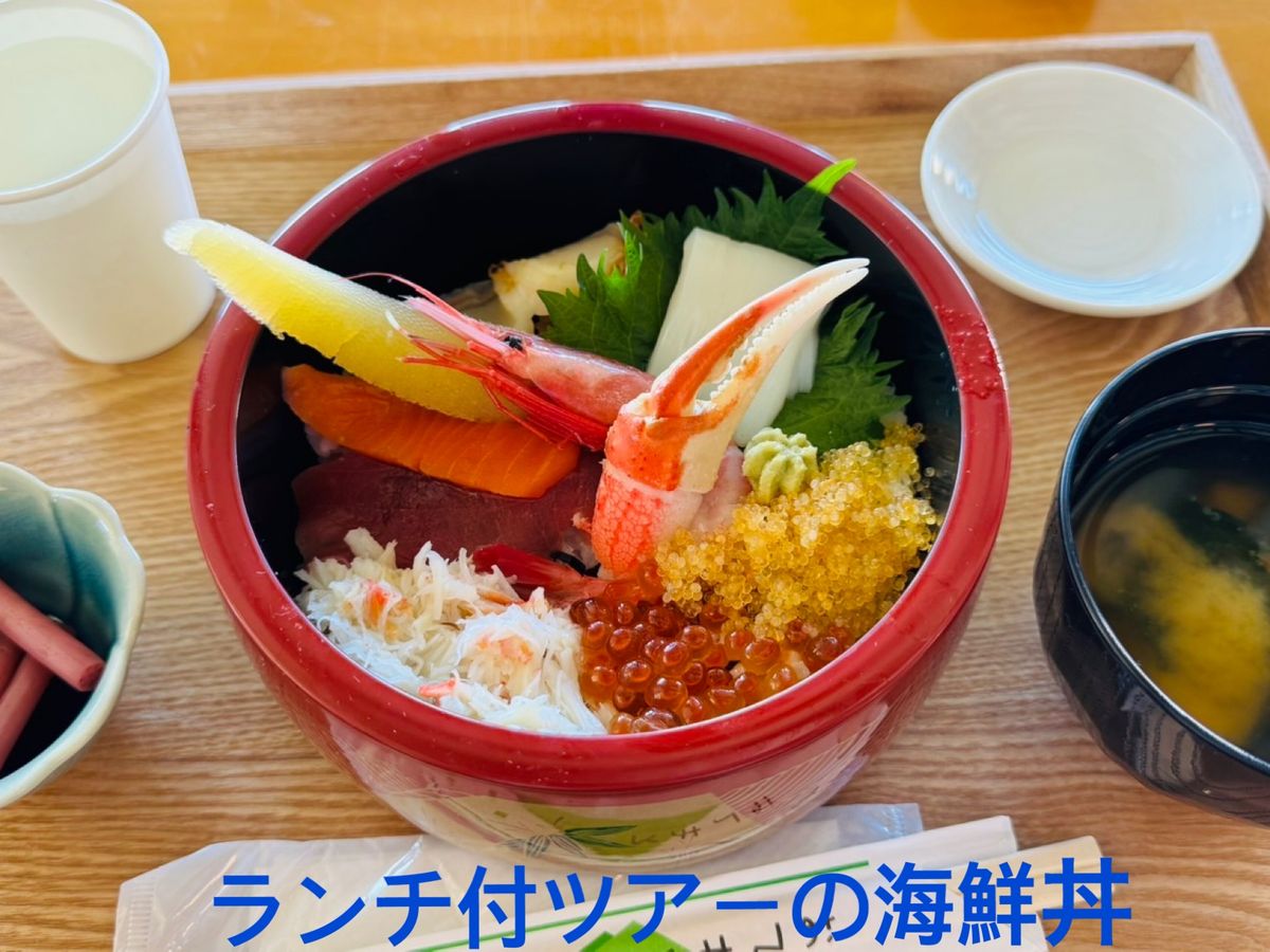 お天気も良かったので、海の積丹ブルーがとてもキレイでした。グラスボートは、希望者のみ参加でしたが、ほぼ全員参加されていました。船からカモメに餌をあげ、皆さん今日イチの盛り上がりでした。ツアーのランチの海鮮丼は期待していなかったのですが、さすが北海道!とても美味しかったです。