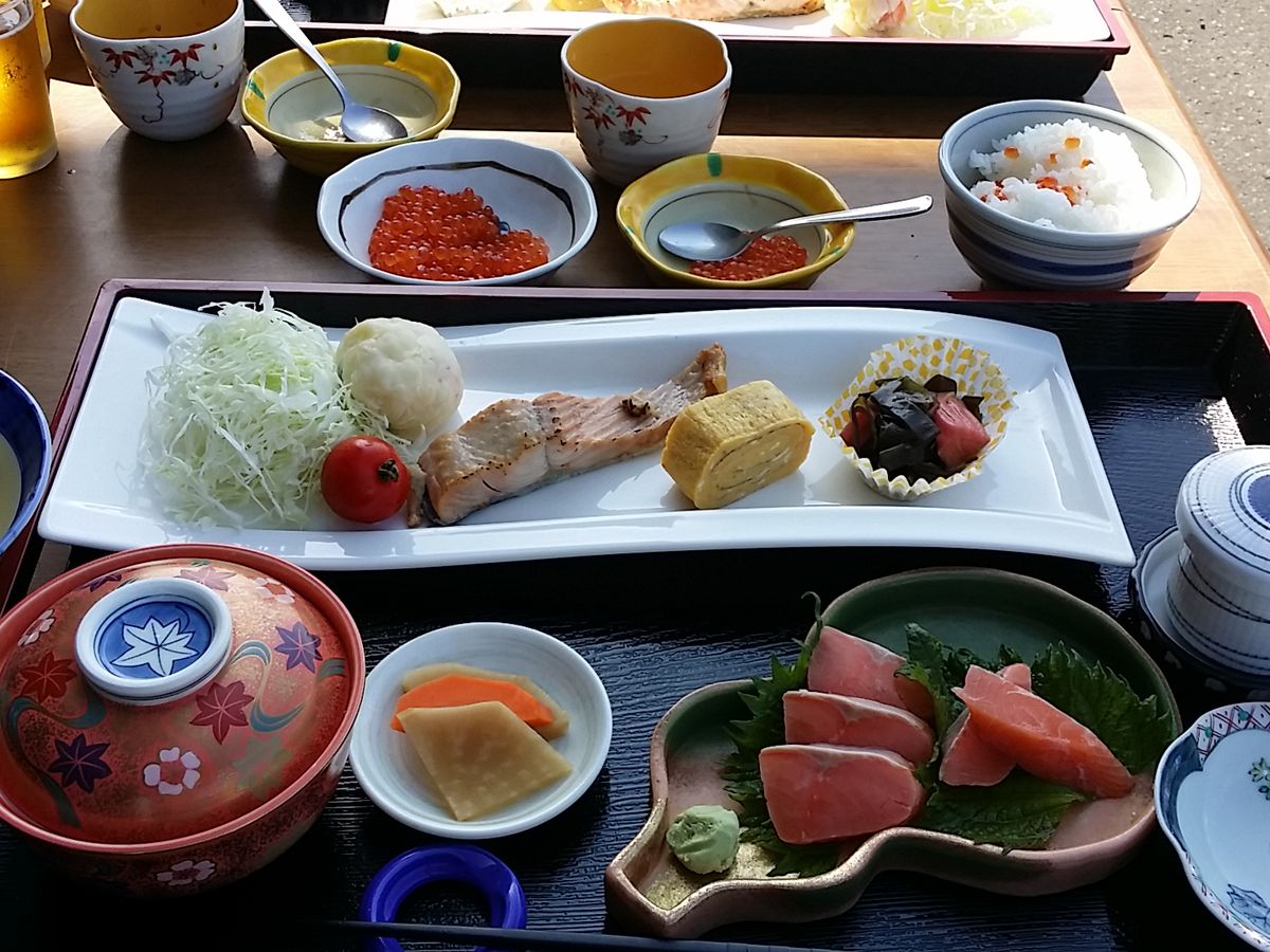 イクラ体験では、刺し身のイクラ、醤油漬け等をいただきました。味見程度と思っていたら、豪勢なお食事付きで、もっとお腹を空かせて行けば良かったなと思いました。併設されている民宿で出している食事のようです。