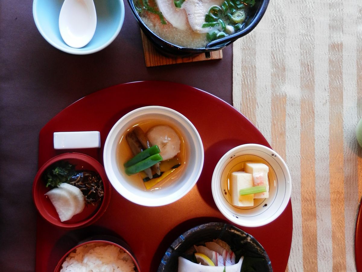 昼食は、小鉢、刺身2種盛り、炊き合わせ、茶碗蒸し、虹鱒、団子汁、漬物、シャーベットという内容で、炊き合わせの里芋饅頭は初めて食べましたがとても美味しかった。団子汁は柚子胡椒を添えると味が締まると思います。他のお味は普通でしたがお腹いっぱいになりました。