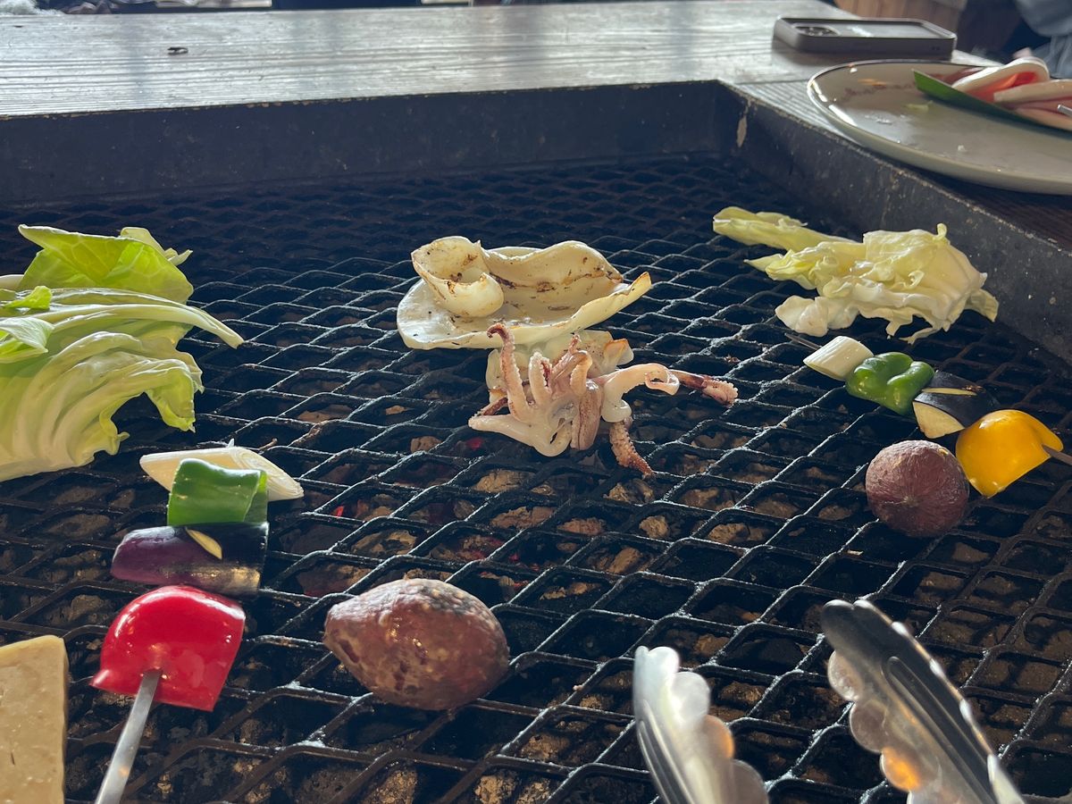 アジ丸々1匹を炭火で焼いていただきました。焼いた水イカとマヨネーズ、柚子胡椒が相性抜群でした。