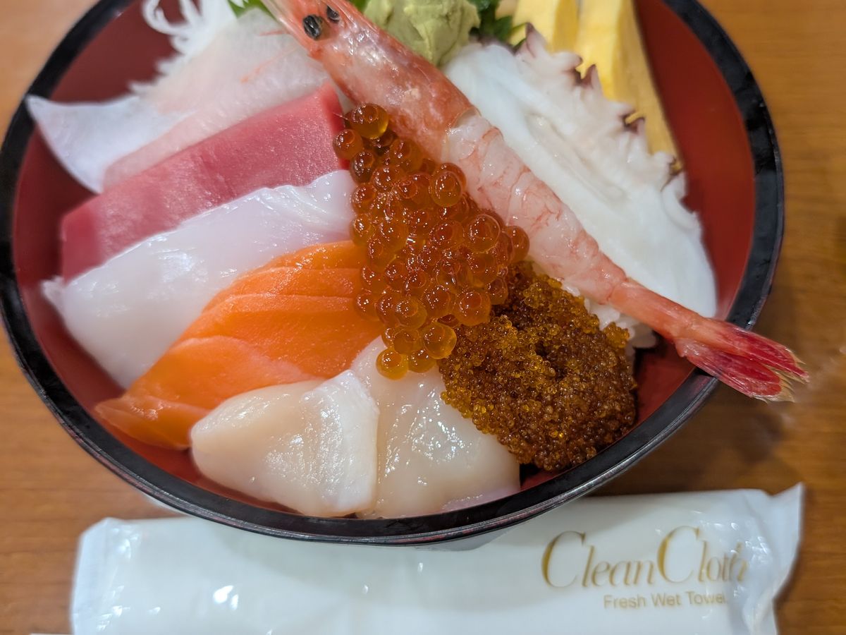 海鮮丼はホタテといくらは乗ってましたが、オーソドックスな海鮮丼だったので、北海道らしさを追求するなら、おまかせではなく自分で選んで頼んだ方がいいかなと思いました。ソフトドリンクが付いてきたのと、お買い物の5%券ももらえたので、お得なプランだったのかなと思います。