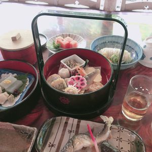 私たちは沖縄の「バショウ」セットを伊勢エビと共に注文しましたが、7000円ほどの価値は確実にありました。料理は完璧に調理されており、各料理は沖縄の料理でした。沖縄料理の良いバラエティを試したいなら、ここが最高の場所です!各料理は紙に英語で記載されており、提供される際に紹介されます。