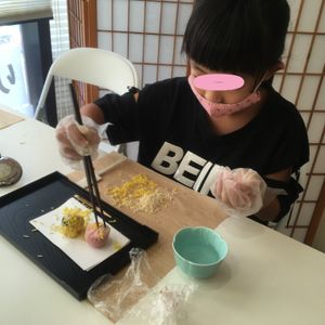念のため、粘土で丸める予習をして向かいました。子供サイズの手袋をしても丸めるのは難しかったようです。うぐいすと梅のきんとんのお見本と比べて変な形ーと言いながらもとても楽しかったようで、今日は良い1日だったと絵日記に書いていました。