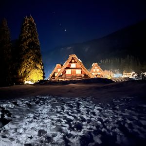 ホームページの写真はまるで七色にきらめくイルミネーションがほどこされているかのような画像。でも実際は要所要所でスポットライトが当たって、合掌造りを照明が照らしてるという感じ。
