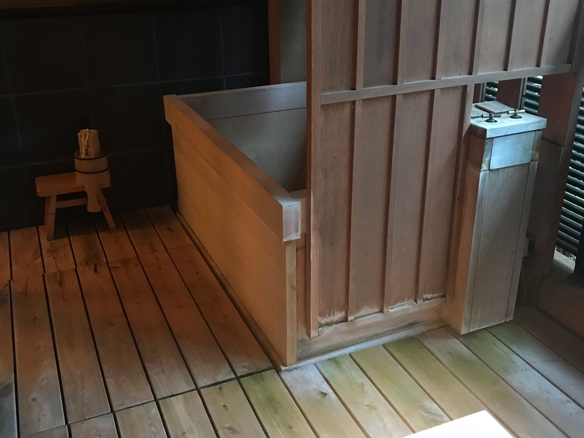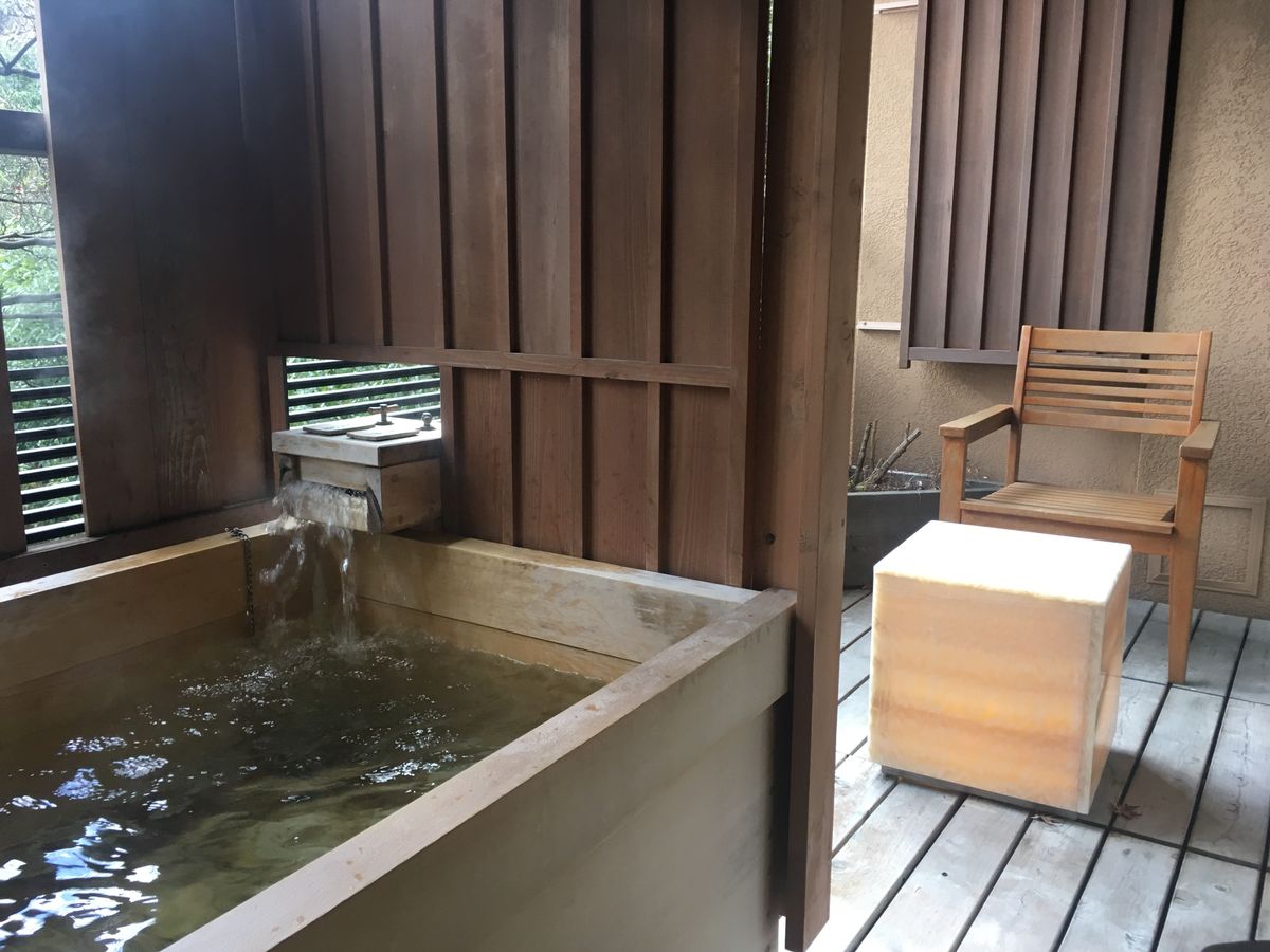 ベランダにはバスタブがあり、川のせせらぎを聞きながらお風呂につかれます。