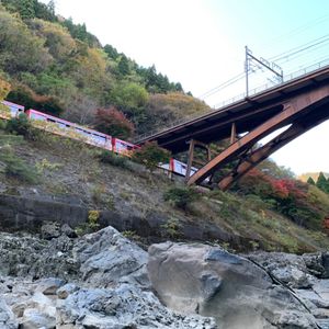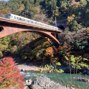 待ち時間無しのスムーズな行程。もちろん日本最長の舟下り前のトイレタイムもあって安心です。 トロッコ列車も川下りもちょうど紅葉真っ盛り!
