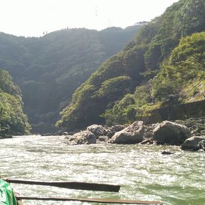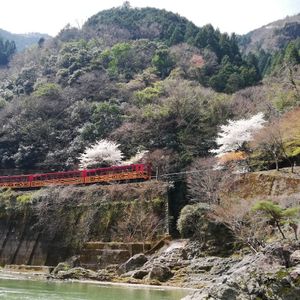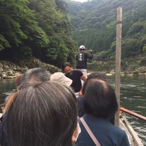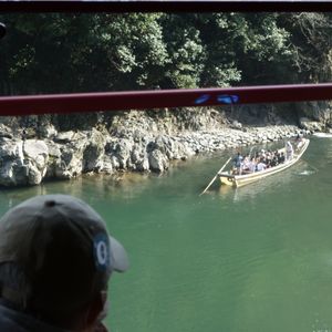 眼下に見ながらトロッコ亀岡駅到着、すぐにバスで船着場へ、少しおやつも買って船に乗船ワクワク、今日は少し水量が多く前に船頭さんと漕ぎ手&MCの3名が交代で後ろにかなりカッコいい舵取り役一名で出発、トロッコ電車、桜、数々の急流を下りながらの約120分。下船後は嵐山散策、竹林の木陰や天龍寺でユックリ出来非常に楽しい一日を過ごしました。また、紅葉の季節に同じコースをぜひ行きたいです。