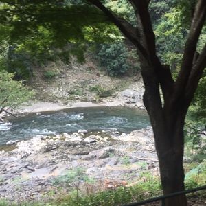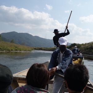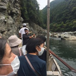 2020.9.26、トロッコ列車と保津川下りのツアーに参加しました。前日は、豪雨で参加者は4名で、川下りは中止ということで心配しましたが、当日は水量も豊富で楽しいツアーでした。いつもは3人の船頭さんが乗り込むそうですが、この日は4人。皆、楽しい話題を提供してくださり、面白かったです。 筋肉もりもりの船頭さんが漕いでくれる様子や竿さばき、そしてかじ取り、若干のスリルも格別でした。400年前から続いている川下り、京都の歴史も感じられました。