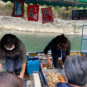 一人での参加でしたので、少し心配でしたが、全く問題無く楽しめました。まずはトロッコ電車ですが、待ち時間も無くすぐに乗れました。私の席が通路側だったので、残念だな〜〜って思ってたら、ガイドさんが電車が発車したら自由に空いてる席に座って良いですから!って言ってくれて、皆さん自由に右に左にと席を移動していました。川下りは、船頭さんの楽しい話を聞きなか約1時間20分ぐらいです。川の水量で時間が変わるみたいです。嵐山に近くなったら、舟が寄って来て、イカ焼き、甘酒や団子、飲み物などなどを、横付けして売りに来てくれます。お昼前ぐらいなので、食べたくなりますね〜〜 下船したら約2時間の自由時間がありますが、皆さん昼食を食べる方や神社仏閣を回られる方色々でした。ガイドさんが非常に話し方が上手で、今まで色々ガイドさんを見て来ましたが、トップクラスでした。