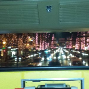 楽しみにしていたナイト観光でしたが、あいにくの雨。キャンセルしようかと思いつつも集合場所に行きました。やっぱり折角なのでバスに乗りましたがガイドさんの説明や、歌が結構楽しく雨のイルミネーションも綺麗