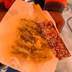 ワカサギの入ったバケツを持って受付に行くと、しばらくしてアツアツの天ぷらにしてくれます。ちゃんと一人7匹ずつありました!味も美味しかったです。ついでに食べたバターじゃがもお勧めです。