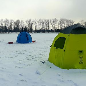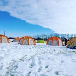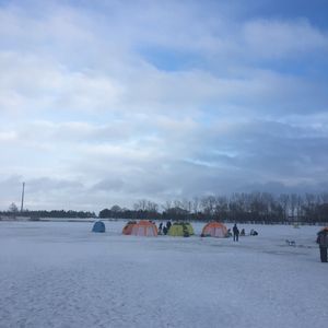 6人で1つのテントで、準備されている穴で釣りを楽しみました。私以外は3匹以上釣れていたんですが、私は2匹でそのうち1匹はワカサギ以外で食べられない魚でした。笑 当たりも全然こなかったんですが、釣りの経験があまりないので、すごく楽しかったです。大きい釣竿などでは扱いが不安ですが、小さくて簡単な操作ばかりなので、楽しくできました。エサを扱うのがすっごく不安だったのですが、とても小さい虫で、凍っているような状態だったので、覚悟していたよりは抵抗なく扱えました。レンタルした長靴だと足の裏が冷たくなってくるので、自前でスノーブーツ等履いてる方はそのままの方がいいかもしれません。