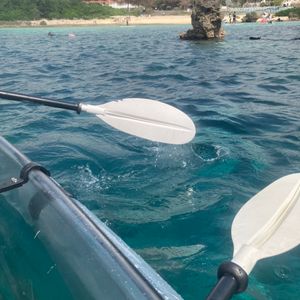 初めての透明カヤックは、乗り出すことなく視点を下に落とすだけで海底の様子が手にとるように窺えて非日常の体験でした。慣れた頃には終了、筋肉痛は覚悟が必要かも知れません。