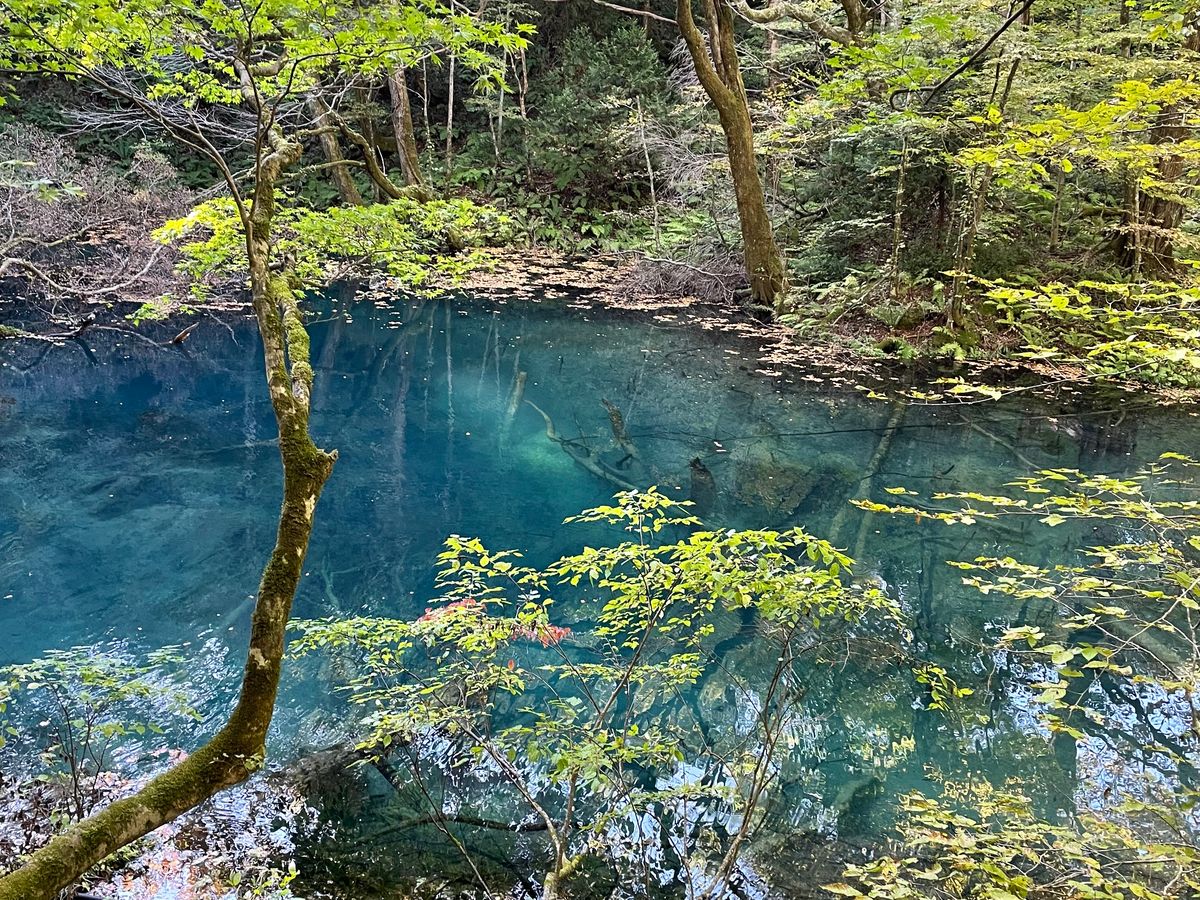 結局空港からレンタカーで十二湖駅まで向かい案内をお願いしました。大崩を見学しながら十二湖の出来た経緯などの説明後、青池、ブナ自然林、沸壺の池などをゆったりペースで歩きながら、白神山地の動植物の説明も細かく丁寧にしていただきました。