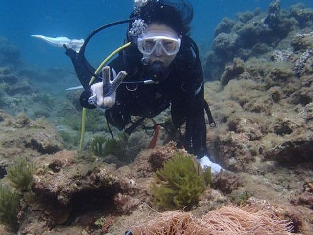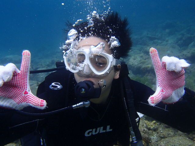 今回、初めて体験ダイビングに参加させていただきました。もともと、泳ぐことが得意ではない私だったので、ドキドキと緊張いっぱいで参加したのですが、インストラクターの方が、緊張をほぐすように詳しく、そして、何度も話を振ってかいわを楽しむように教えて下さったので、海に入る頃には、ウキウキしかなかったです。実際に、潜った時からダイビングが終わってしまうまでの時間ずっと、海の中の世界に夢中で、息をするのを忘れそうなくらい最高なひと時でした。