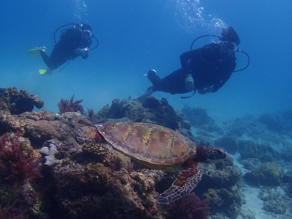 スキューバの午前と午後の1日コースで午前はレクチャーをした後、実際に潜って初スキューバの少しづつ感覚をつかみながら海の中の世界楽しみました。目的のウミガメさんは一瞬見えたくらいで戯れるほどではありませんでした。しかし、午後の部ではウミガメさんが1mほど目の前を優雅に泳いでくれるという最高の体験をしました!しかも、2回も笑