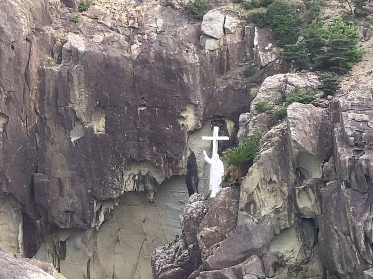 港を離れてまず樹齢670年を超えると言われるあこう樹の下をくぐって神社をお参りします。上五島のパワースポットのようです。その後、島の反対側の桐地方方面に移動して、待機していたレジャー船に乗り換えます。大きな船ではありませんが、天気も良かったせいかそれほど揺れませんでした。そこからキリシタン洞窟を目指します。船を操縦する方と案内してくれる方のお二人が対応してくれました。案内いただいた方はしきりに、いま満潮なので上陸できなくて申し訳ないと行ってらっしゃいましたが、もともと上陸できないことを前提のツアーなのでかまいません。マリア像と十字架は遠くからでもはっきりと拝見出来ました。帰りの航路でも、野生動物が見えたり、養殖場所が拝見できたり、興味深かったです。